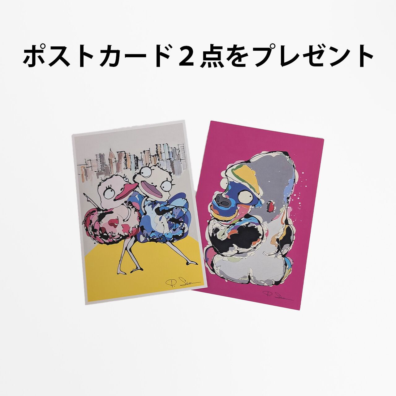 プレゼントの2枚のポストカードと一緒に人気作品「Winning Dance」(アオアシカツオドリ)を印刷した箱に収めてお届けします。